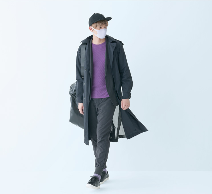 블랙 코디에 퍼플을 더했다면 라벤더 PITTA MASK가 등장할 차례.통일감이 생겨 산뜻한 라벤더가 쿨하게 완성됩니다.