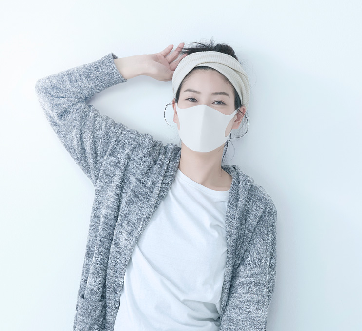 気持ちのいい素材感と締め付けのないデザインによる癒しのゆったりスタイル。メイクスポンジと同じ素材のPITTA MASKなら、優しい肌ざわりで乾燥からも守ってくれる。