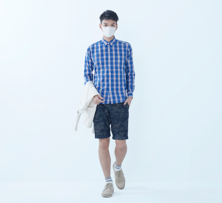 天気のいい日のお出かけは、爽やかな王道スタイル。PITTA MASKならスタイルの清潔感を邪魔せずに、なだらかな曲線フォルムがオシャレに馴染む。鮮やかなブルーのシャツに、カモフラのハーフパンツで、ディティールにこだわったこなれ感を演出したい。