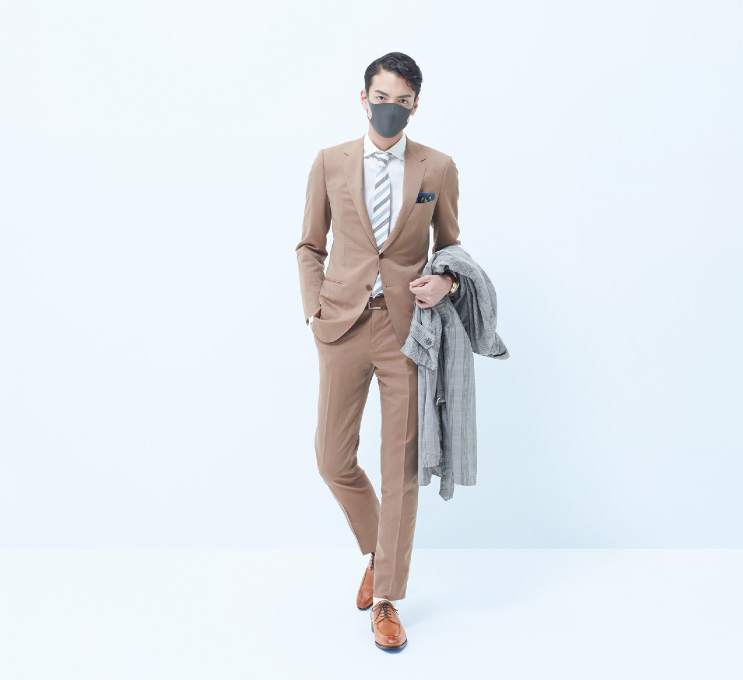融入日光暖阳,带给人清爽潇洒印象的淡棕色西装。有了领带、外套、PITTA MASK GRAY的烟灰色,以淡色调为主的搭配,倍增精致的深度感。