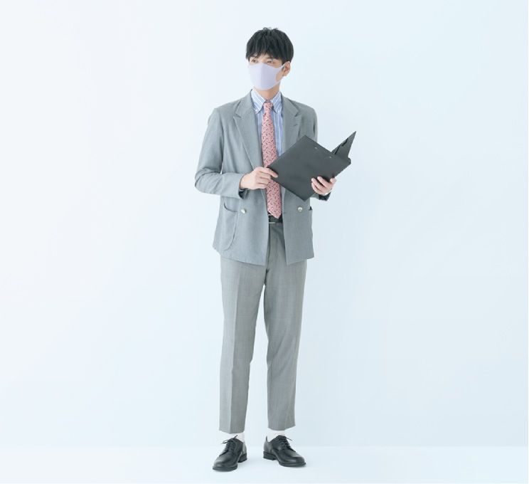 全身以淡灰色統一的高品味成熟外套裝束。粉色領帶和完美搭配的淡紫色PITTA MASK,帶來幾分跳躍感。